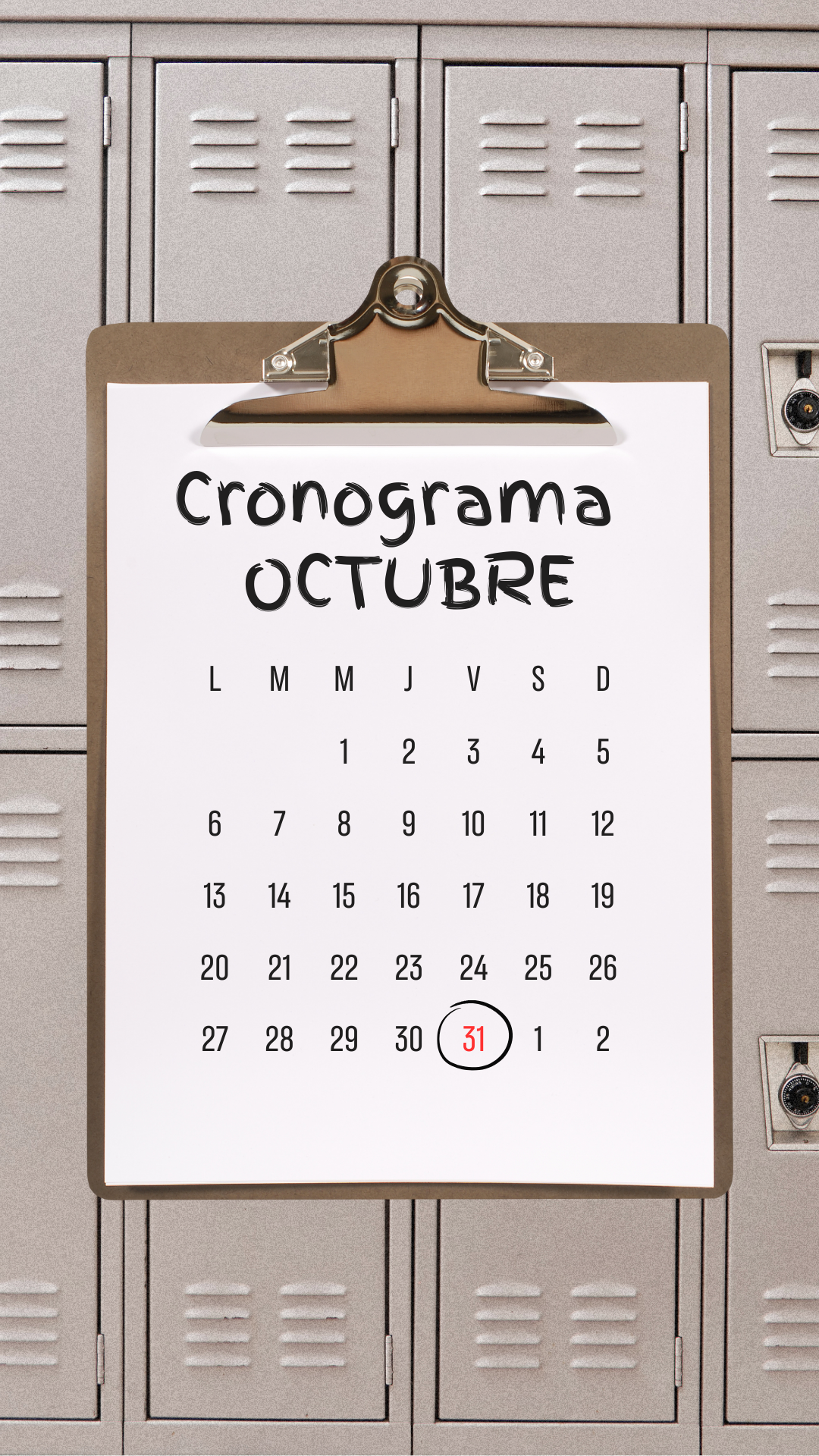 Estimada Comunidad Escolar, en el siguiente cronograma se encuentran detalladas las evaluaciones en las distintas asignaturas para el mes de octubre, que deberán cumplir oportunamente en la fecha correspondiente: